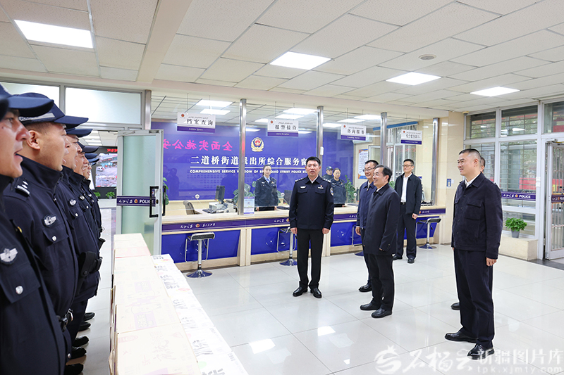 10月5日,自治区党委书记、兵团党委第一书记、第一政委陈小江在乌鲁木齐市公安局二道桥街道派出所,看望慰问基层政法干警,向节日期间坚守岗位的一线干部职工致以亲切问候。石榴云/新疆日报记者崔志坚摄