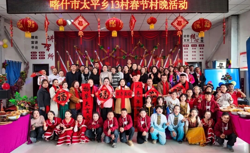 2月12日,喀什市太平乡桑村举办“万马奔腾兴家乡·同心共舞幸福年”春节联欢晚会,驻村工作队、村“两委”与各族群众欢聚一堂,载歌载舞喜迎新春。