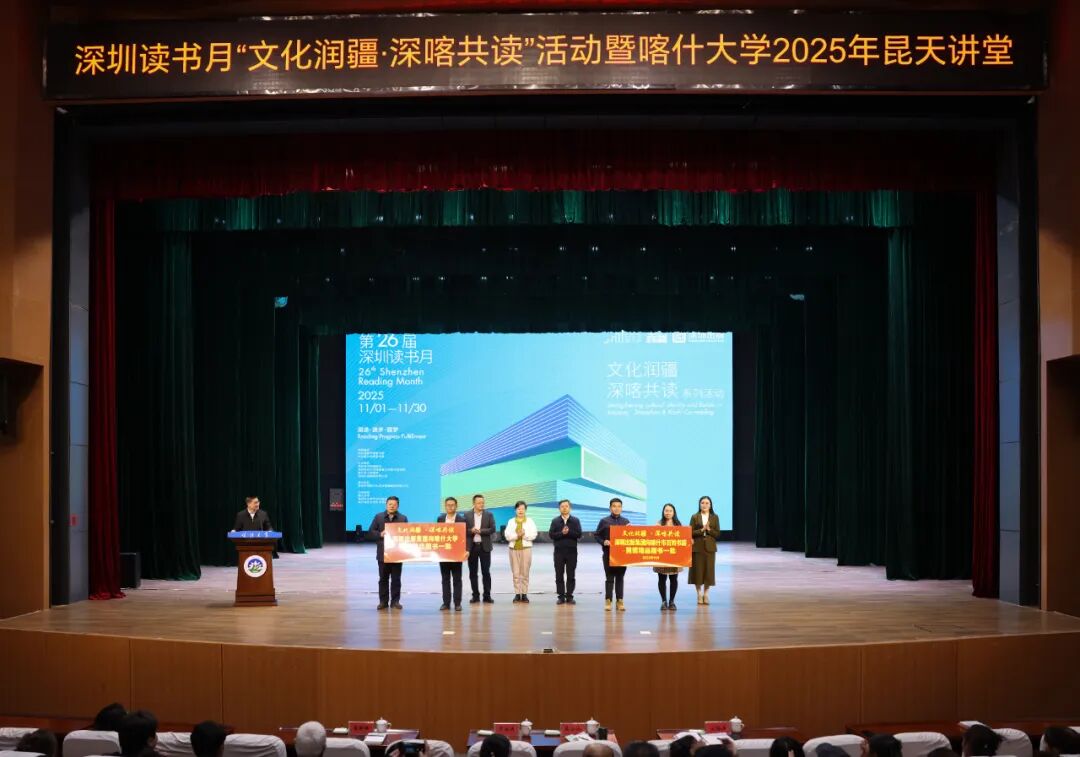 启动仪式上,与会人员集中观看了第26届深圳读书月宣传视频,直观感受“全球全民阅读典范城市”的文化活力。深圳市对口支援新疆工作前方指挥部负责人介绍了2025深圳读书月“文化润疆·深喀共读”重点活动内容,主要包括“丝路论道,文艺无界”专题讲座、“从喀什出发:拥抱人工智能新时代”科普讲座、“心有阳光,自有力量”心理讲堂、“律动燃梦workshop”街舞大师课、“萌趣悦读,童行派对”IP分享会、“瓶纳万象,非遗有Young”内画艺术工坊、“科幻筑梦,山海同行”儿童文学讲座、读书月精品图书捐赠、深喀文学家采风交流、深喀文艺作品创作出版等特色活动,深化两地文化交融,让深圳的阅读氛围与创新理念扎根喀什,同时向深圳展现新疆多元文化魅力,实现双向滋养、携手共进。