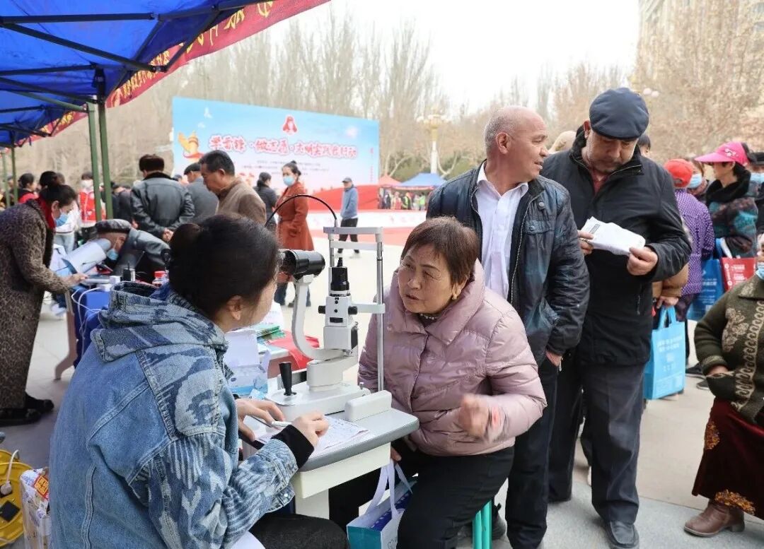 健康义诊区前,医护人员为老人细致检查视力、耐心讲解护眼知识;义剪服务区内,市残联志愿者为环卫工人、老年人等群体免费理发,传递浓浓温情。