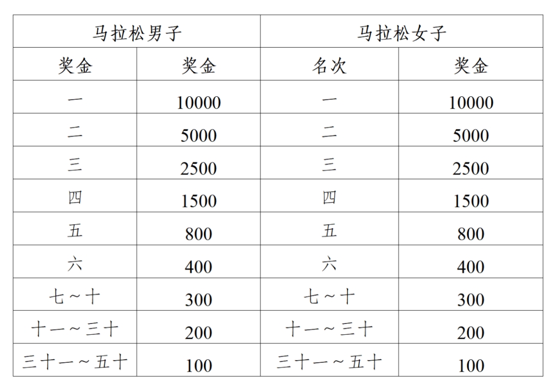 2. 名次奖:马拉松男、女第一至第五十名运动员分别获得如下表所列的奖金(单位:人民币),第一名至第三名运动员分别颁发奖杯一座、奖牌一枚。注:现场不发放奖金。(前八名按照枪声成绩、九到五十名按照净成绩)
