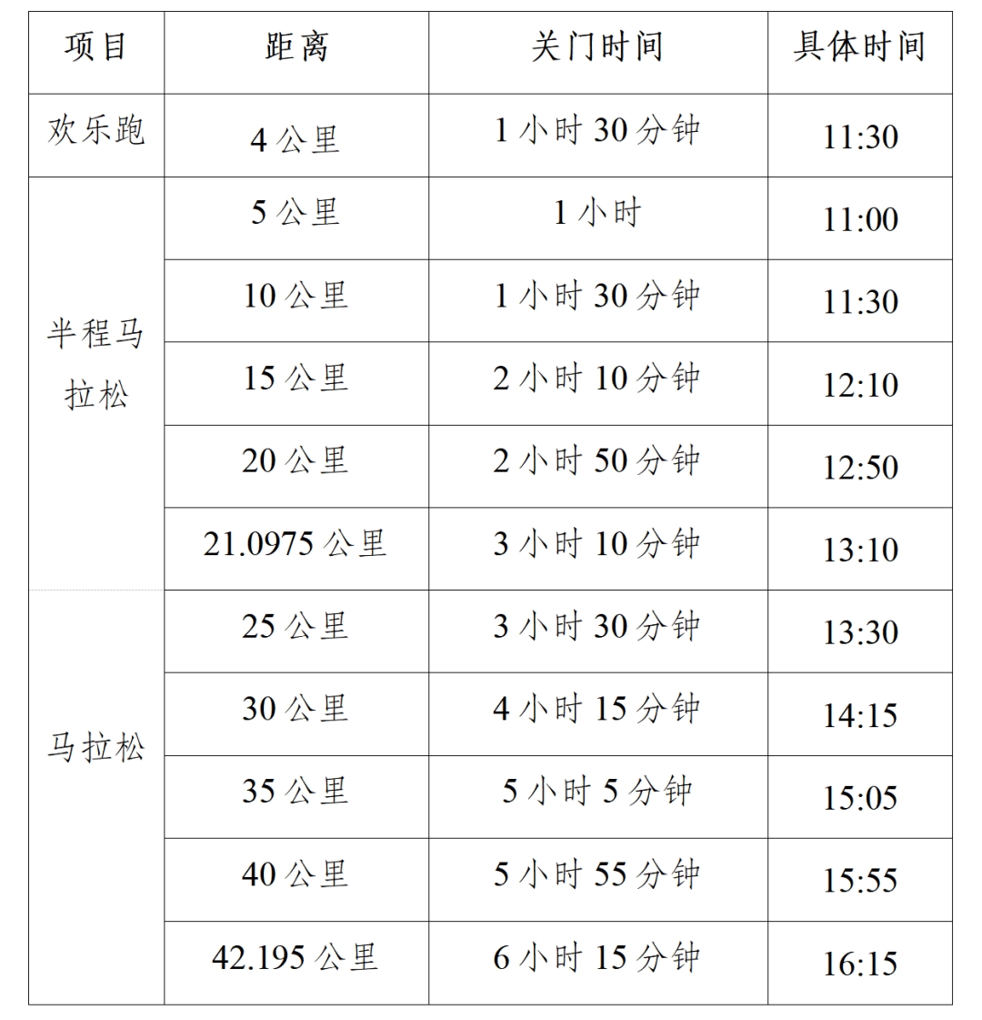 各项目关门时间见下表(以鸣枪出发时间计算):