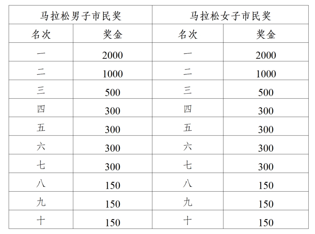 2. 凡喀什市民(须持有喀什市居民身份证或喀什市暂住证且有效期在2025年11月2日及以后)参加马拉松比赛,男、女第一名至第十名选手分别获得如下表所列的奖金(单位:人民币)