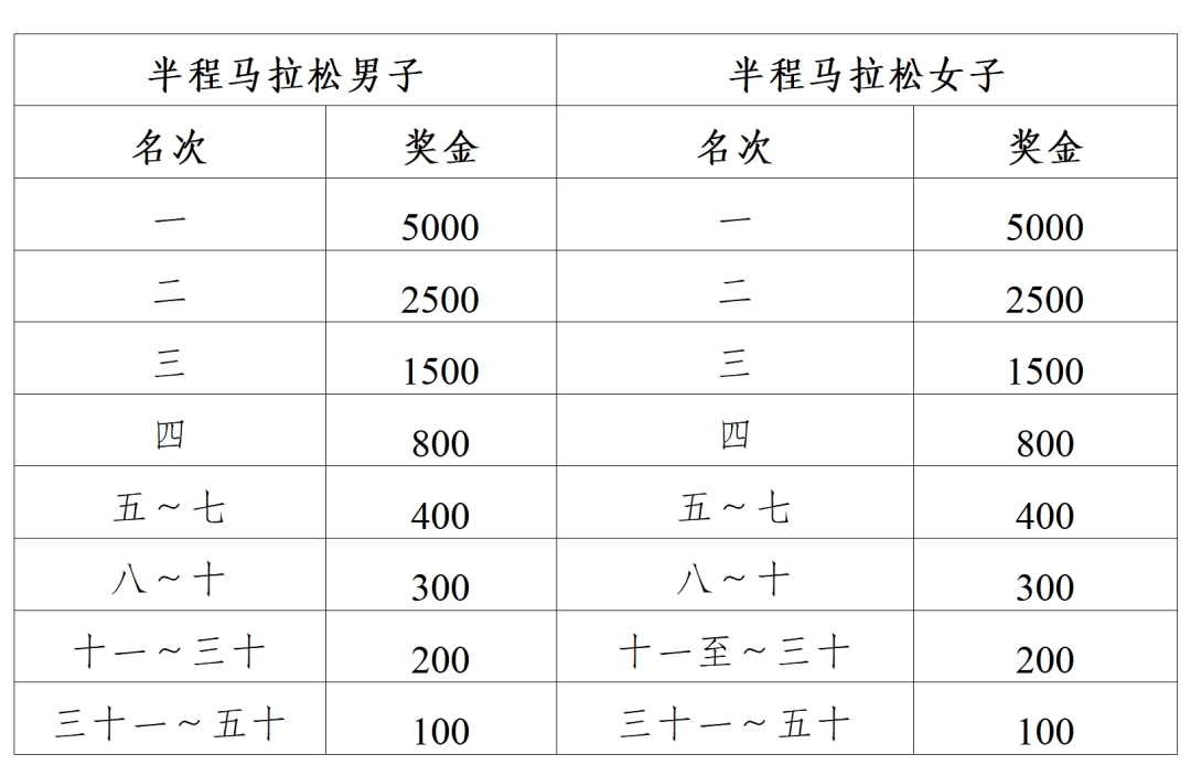 半程马拉松项目按净计时成绩录取名次。名次奖:半程马拉松男、女第一至第五十名运动员分别获得如下表所列的奖金(单位:人民币),第一名至第三名运动员分别颁发奖杯一座、奖牌一枚。(前八名按照枪声成绩、九到五十名按照净成绩)