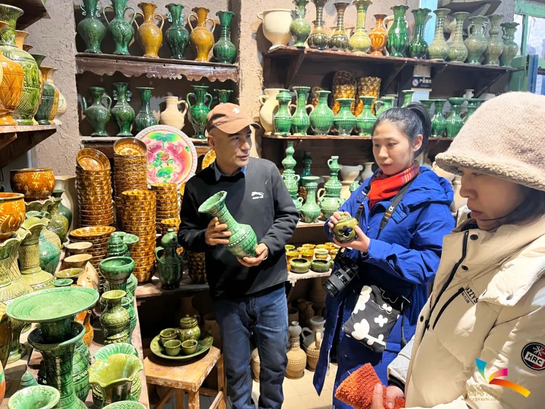祖力甫卡尔·阿巴拜克力向游客介绍土陶制品。喀什地区融媒体记者王子懿摄