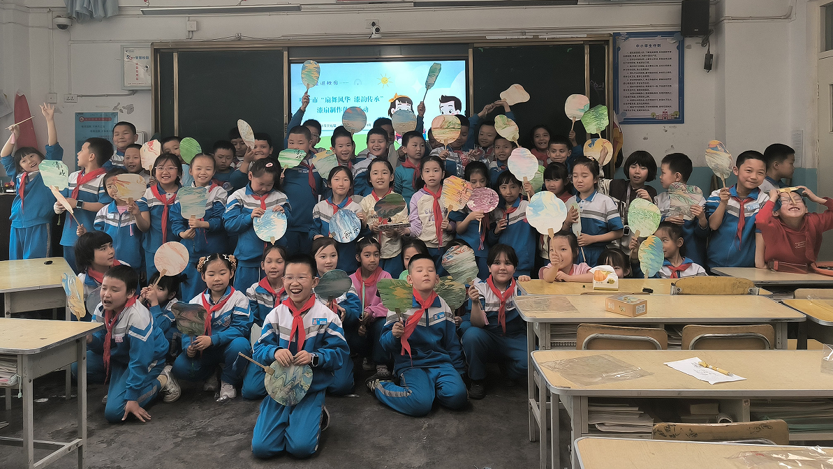 在实践环节,学生们手持团扇化身“小小艺术家”,按照老师传授的“旋转法”“Z字法”,小心翼翼地将扇面浸入水中,创造出独一无二的漆扇作品。活动尾声,非物质文化遗产知识问答互动将现场气氛推向高潮,学生们踊跃抢答,在收获知识的同时,还获得了精美的纪念品。
