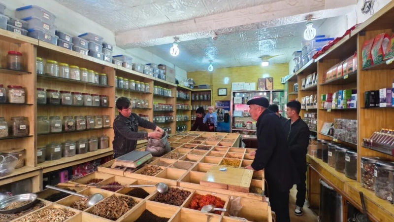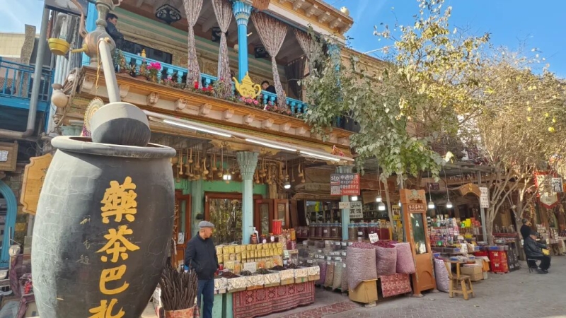 走进喀什古城药茶巴扎,空气中弥漫着药草与花果交织的独特芬芳。库尔班江茶调料店是当地小有名气的百年老字号店铺,店主库尔班江·阿布都瓦依提巧妙地将茶的美味口感与养生功效融于一体,根据顾客体质和需求,调配出罗勒助眠茶、菊苣降压茶、薄荷降火茶、石榴花降糖茶等20多种特色茶饮。