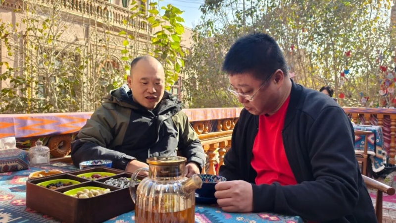 为了更全面、更深入地推广喀什药茶文化,库尔班江·阿布都瓦依提与来自福建的茶文化爱好者谢文聪等人,共同经营了一家别具特色的喀什药茶文化馆。