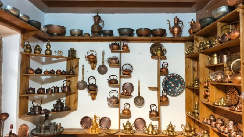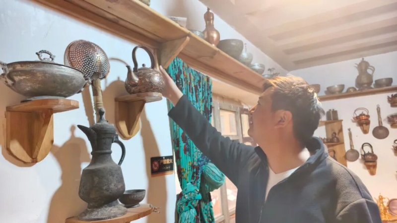 铜器制作技艺作为国家级非物质文化遗产代表性项目,在高台民居第六代铜匠木合塔尔·马木提铜壶制作技能大师工作室展架上,各式各样的铜器错落有致,茶壶、茶杯、铜盆、铜锅、铜碗、果盘等精美铜器琳琅满目,在这里焕发出勃勃生机。
