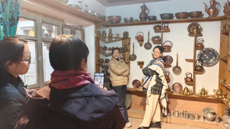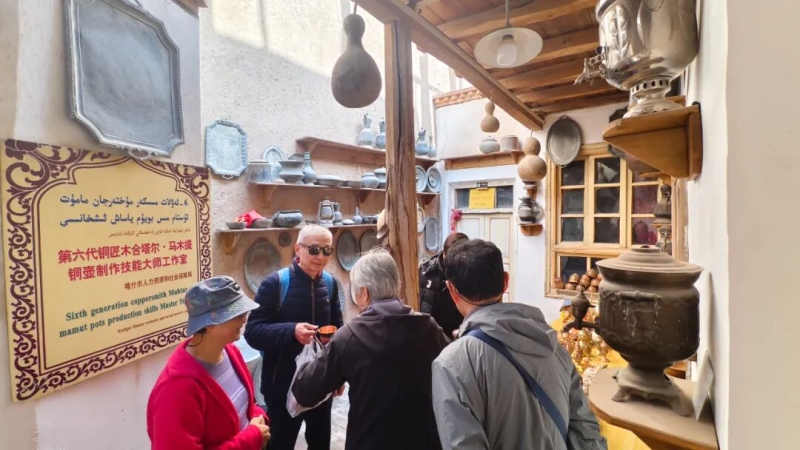 这样纯手工打造的铜器深受游客喜爱。乌鲁木齐游客马伟强在工作室里对精湛的工艺品表示称赞。“亲眼见到这种纯手工制作的铜器,才真切感受到每件铜器上的花纹都藏着讲究与用心,这是喀什旅游众多工艺品中最独特的一种。”乌鲁木齐游客马伟强说。