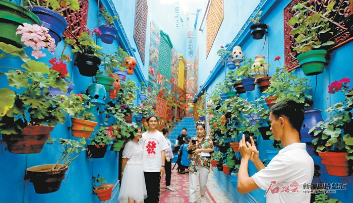 6月13日,喀什古城景区塔哈其巷新打造的网红打卡点——“彩虹巷”吸引众多游客前来拍照留念。