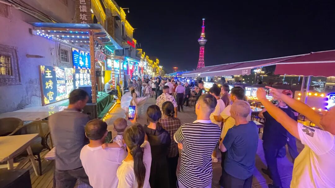 当夜色渐深,喀什古城景区印象一条街化身为音乐的海洋,民谣、流行、摇滚等各类音乐此起彼伏,热闹的人流在音乐中穿梭。各商家更是巧花心思,将美食、烧烤和特色饮品结合起来,让游客充分享受夜间浪漫。