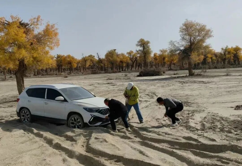 最让她动容的是沙地里一场“不问回报的援手”。在前往139胡杨秘境的途中,李妍枫的车辆不慎陷入松软沙地,进退两难。当时手机信号微弱,周围荒无人烟,正当她焦急万分地在路边挥手求助时,一辆新疆牌照的汽车缓缓停下。没等她说明情况,车上三位衣着干净的年轻小伙便立刻下车,撸起袖子就钻到车底寻找挂钩。沙子灌满了鞋缝,灰尘沾满了衣衫,他们却顾不上擦拭,齐心协力用绳索将被困车辆稳稳拉出。救援结束后,小伙子们用自带的纯净水洗完手,便默默驱车离开,连姓名都未曾留下。“看着他们远去的背影,我心里满是感动,这里人的热情,是不带任何功利的纯粹善意。”李妍枫至今回忆起来,仍难掩激动。
