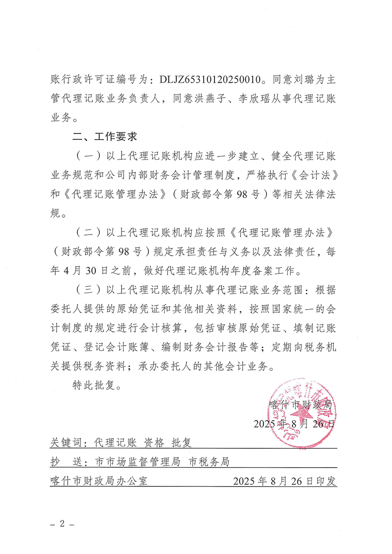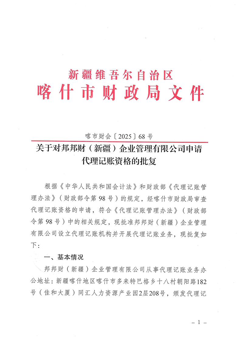 喀市财会〔2025〕68号—关于对邦邦财(新疆)企业管理有限公司申请代理记账资格的批复