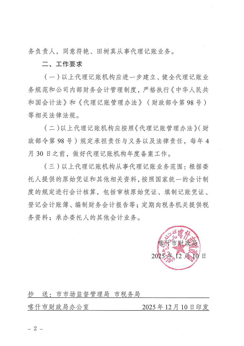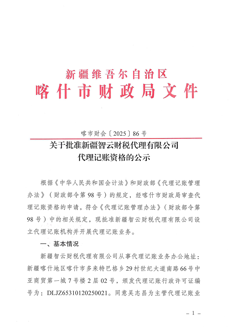 喀市财会〔2025〕86号关于批准新疆智云财税代理有限公司代理记账资格的公示