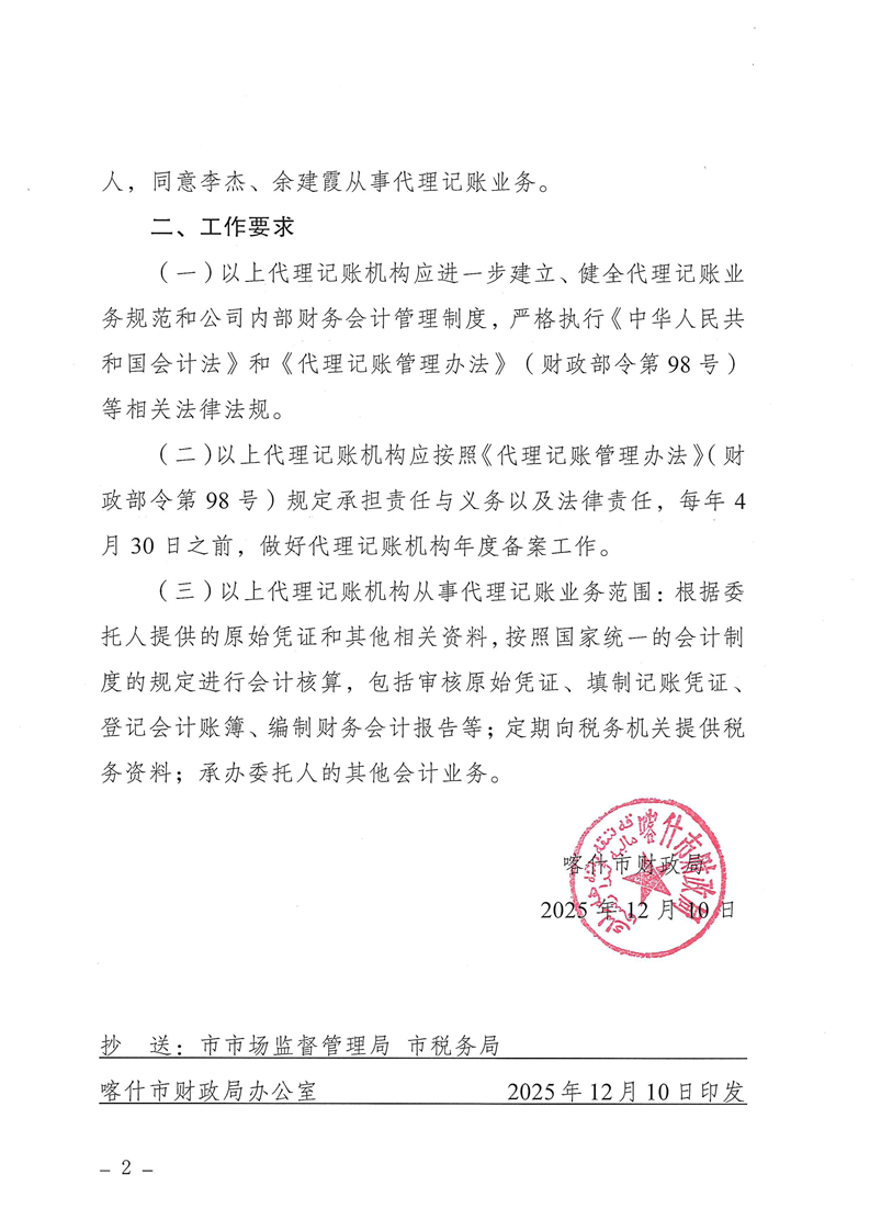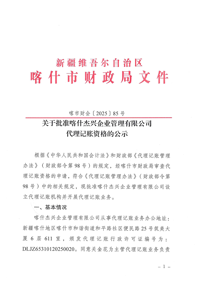 喀市财会〔2025〕85号关于批准喀什杰兴企业管理有限公司代理记账资格的公示
