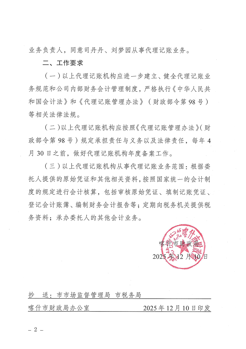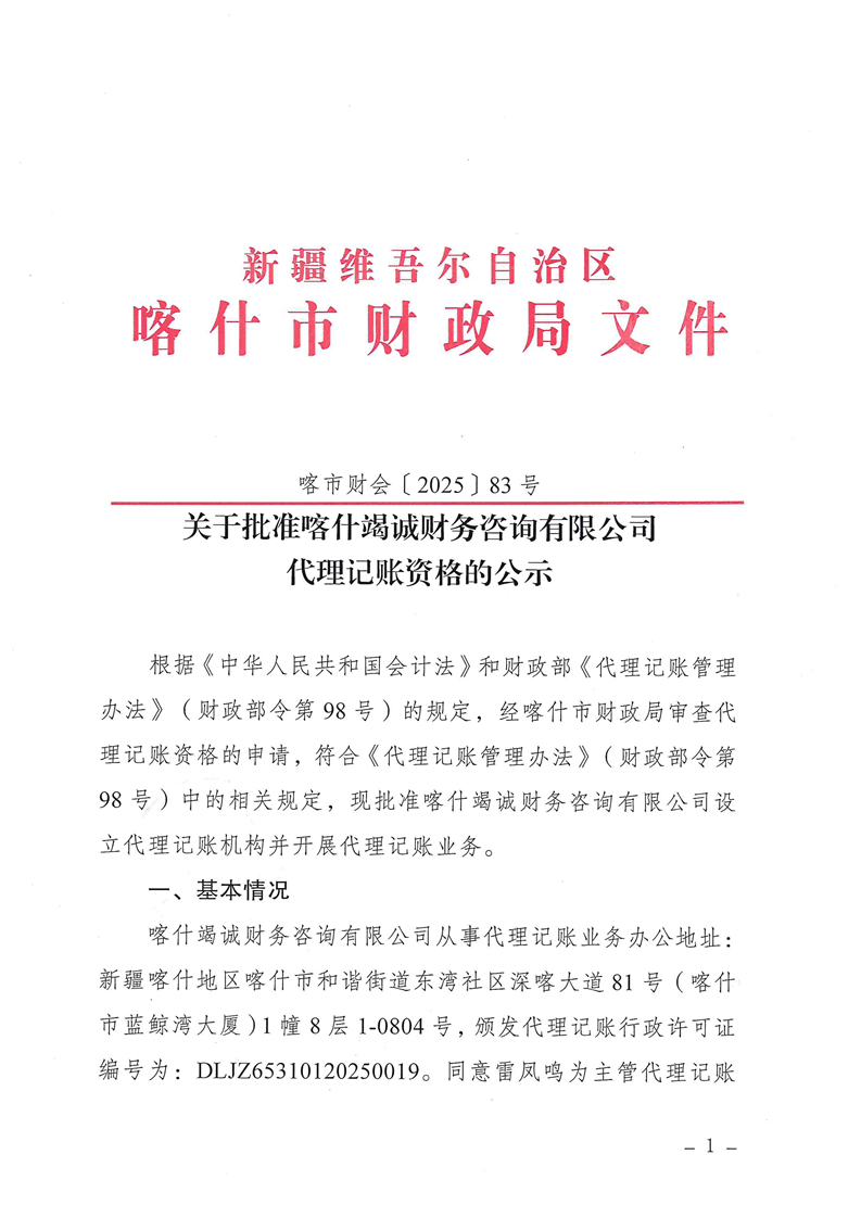 喀市财会〔2025〕83号关于批准喀什竭诚财务咨询有限公司代理记账资格的公示