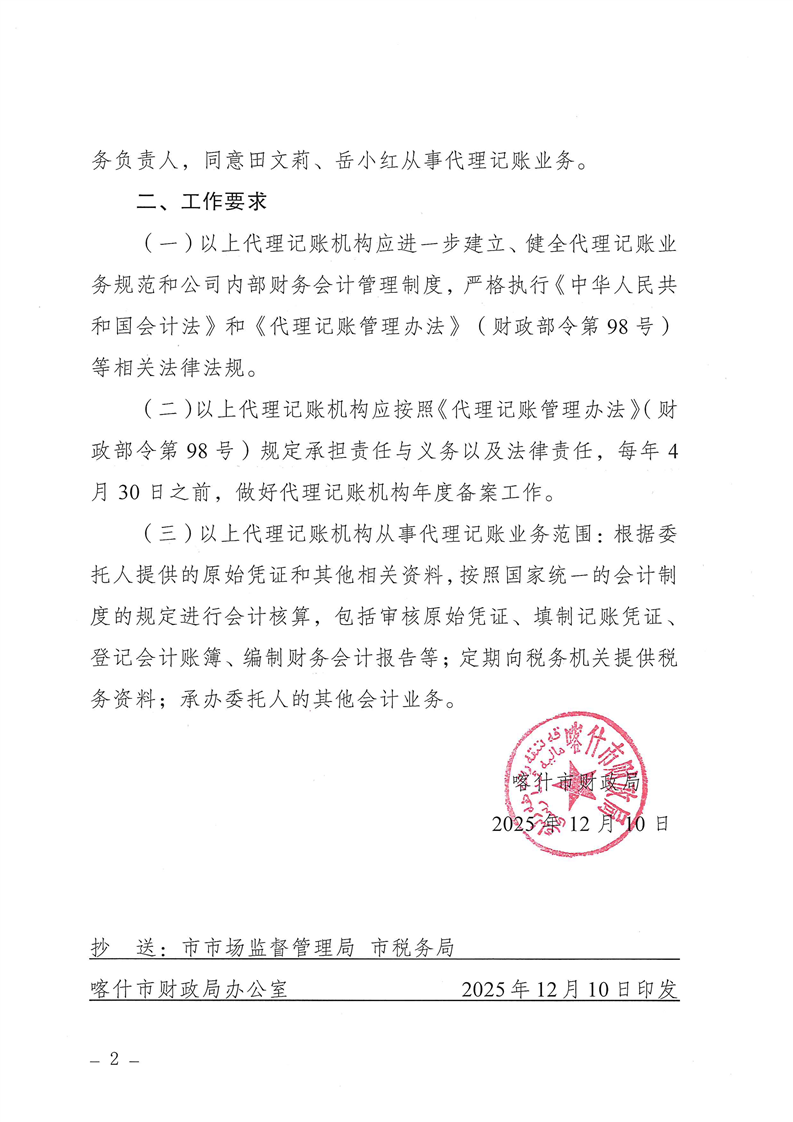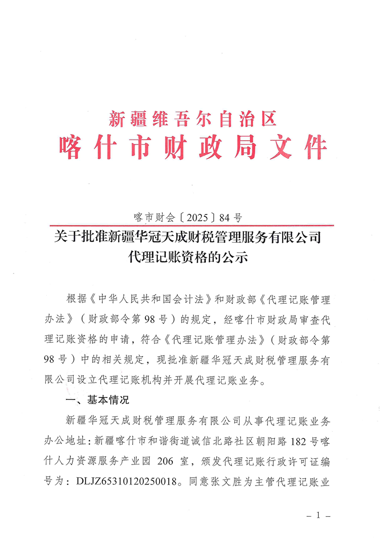 喀市财会〔2025〕84号关于批准新疆华冠天成财税管理服务有限公司代理记账资格的公示