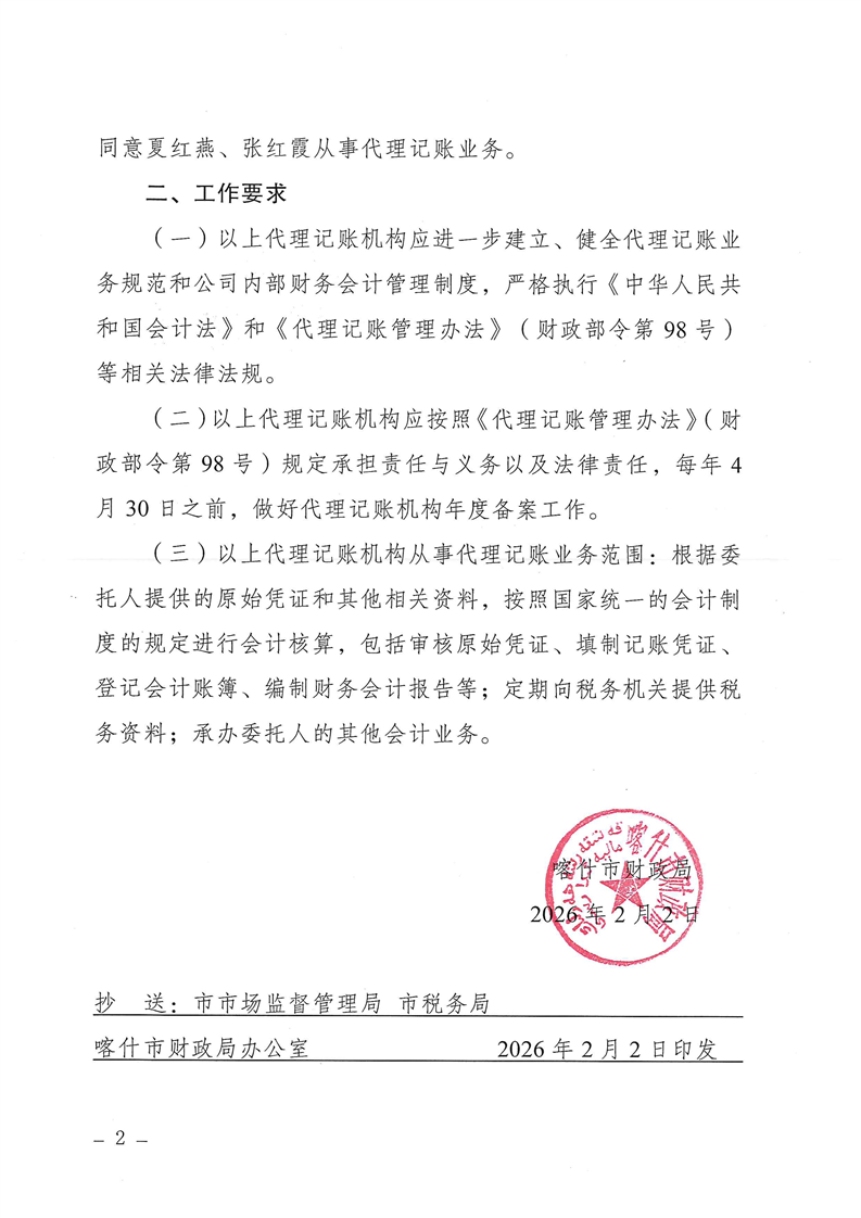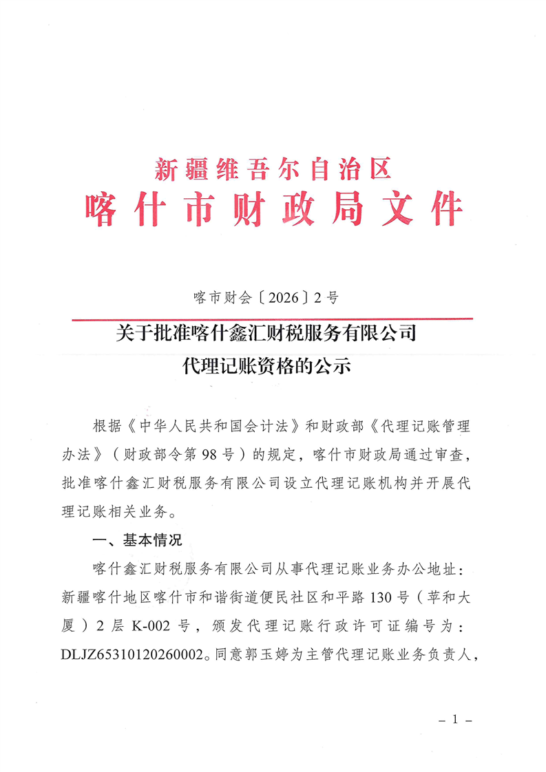 喀市财会〔2026〕2号关于批准喀什鑫汇财税服务有限公司代理记账资格的公示