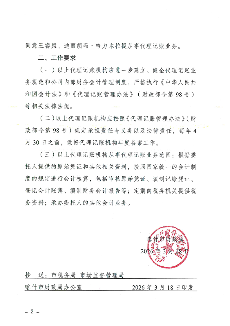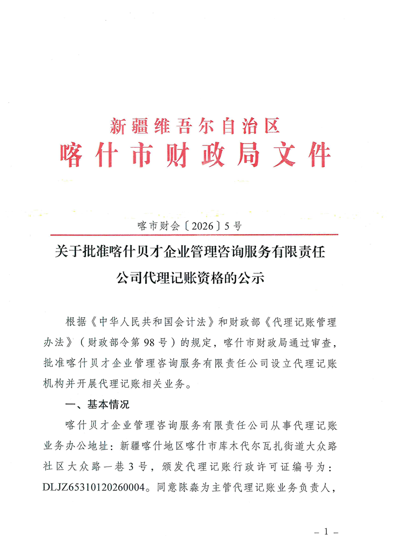 喀市财会〔2026〕5号关于批准喀什贝才企业管理咨询服务有限责任公司代理记账资格的公示