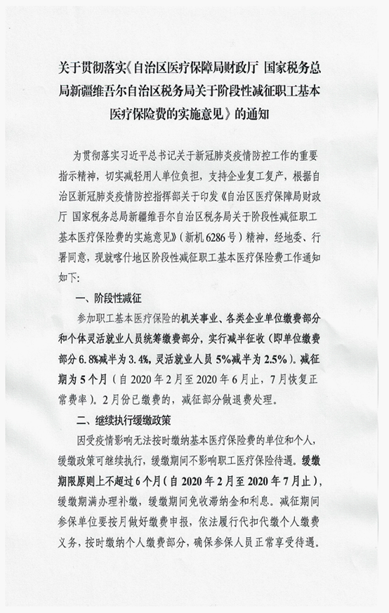 1、《关于贯彻落实自治区医疗保障局财政厅国家税务总局新疆维吾尔自治区税务局关于阶段性减征职工基本医疗保险费的实施意见的通知》.doc