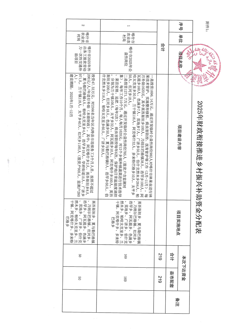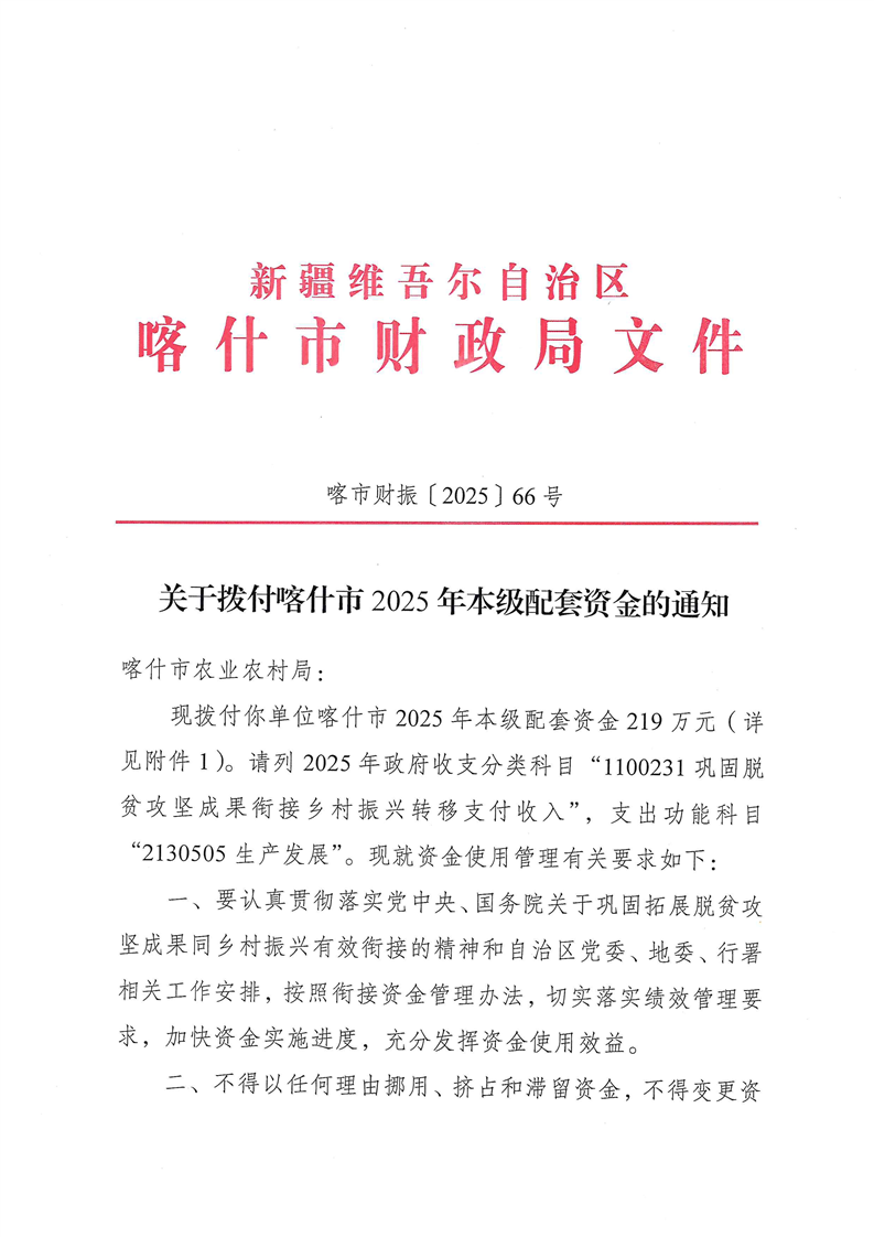 喀市财振【2025】66号-关于拨付喀什市2025年本机配套资金的通知