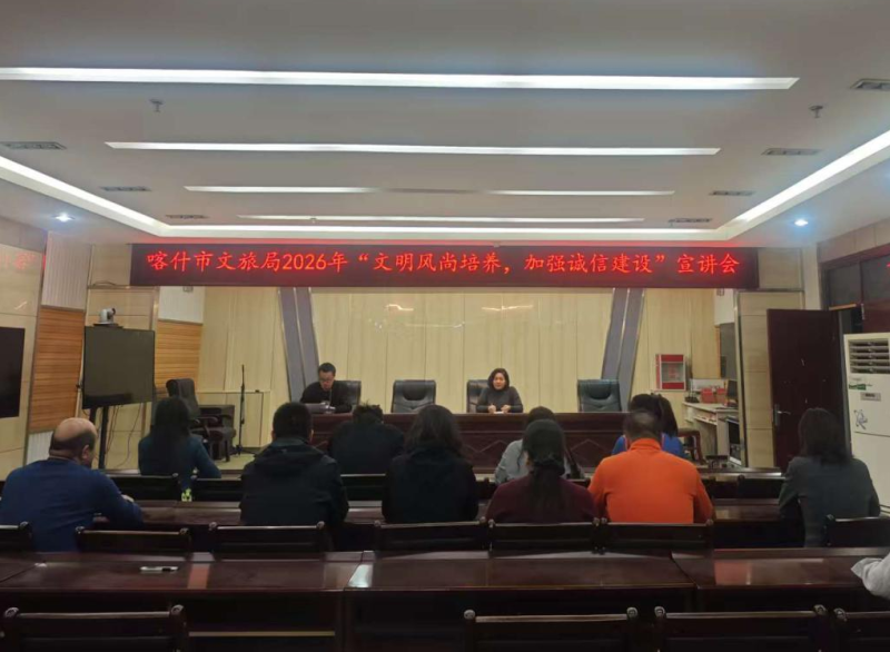 为持续提升喀什市文旅行业文明服务水平,筑牢文旅市场诚信经营底线,近日,喀什市文化体育广播电视和旅游局召开2026年“文明风尚培养加强诚信建设”主题宣讲会。局机关相关科室负责人、全市重点景区及文旅经营商户代表等参加会议。