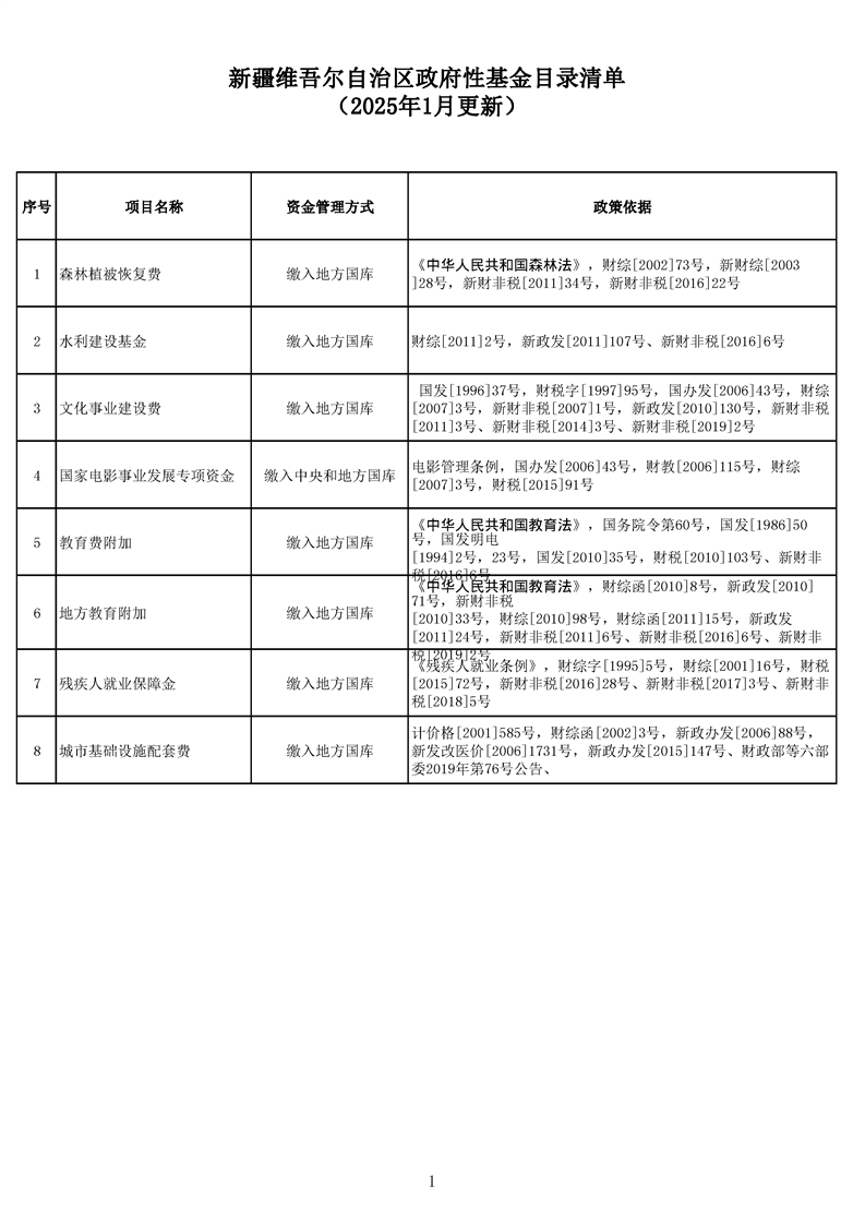 新疆维吾尔自治区政府性基金目录清单(2025年1月更新)
