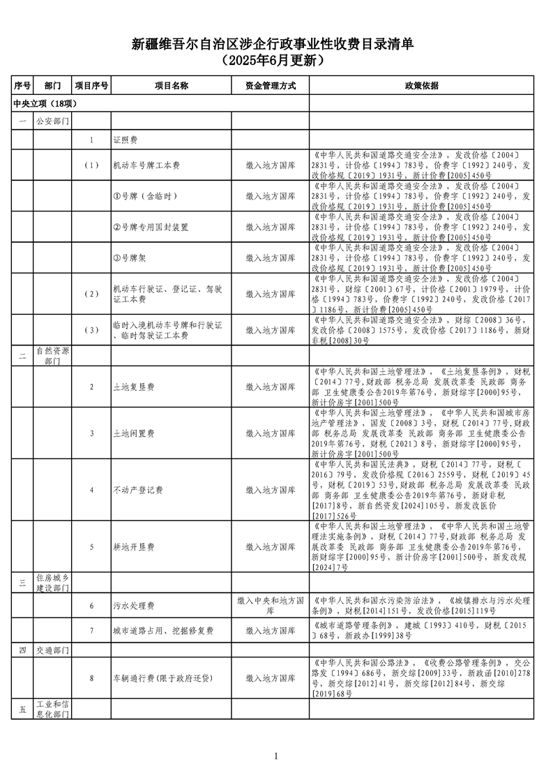 新疆维吾尔自治区涉企行政事业性收费目录清单(2025年6月更新)