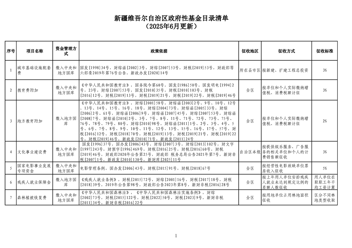 新疆维吾尔自治区政府性基金目录清单(2025年6月更新)