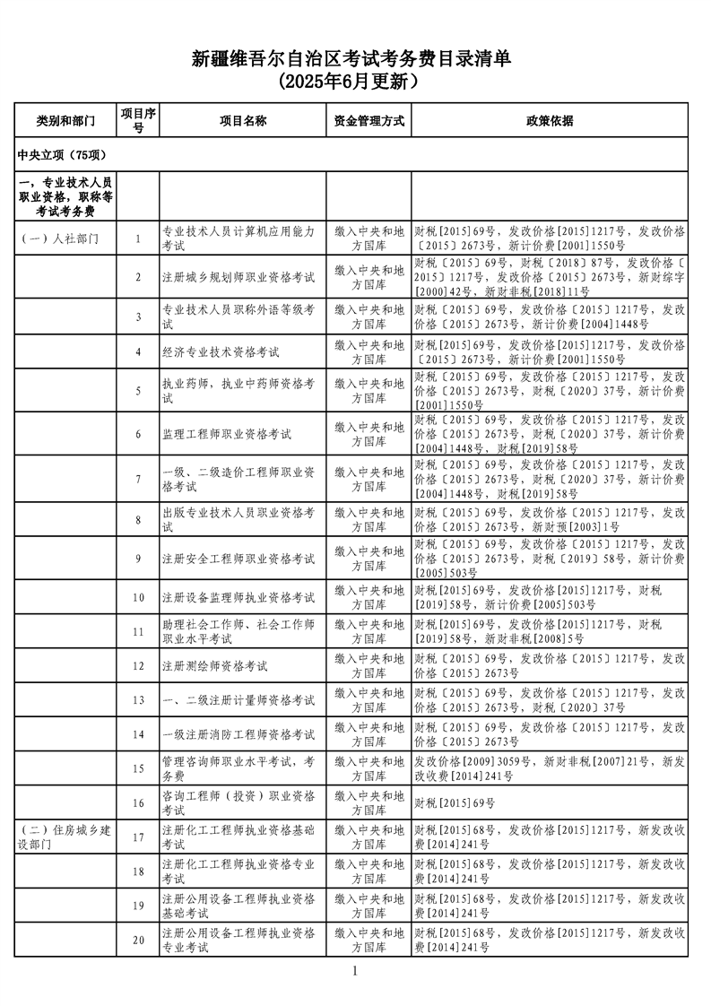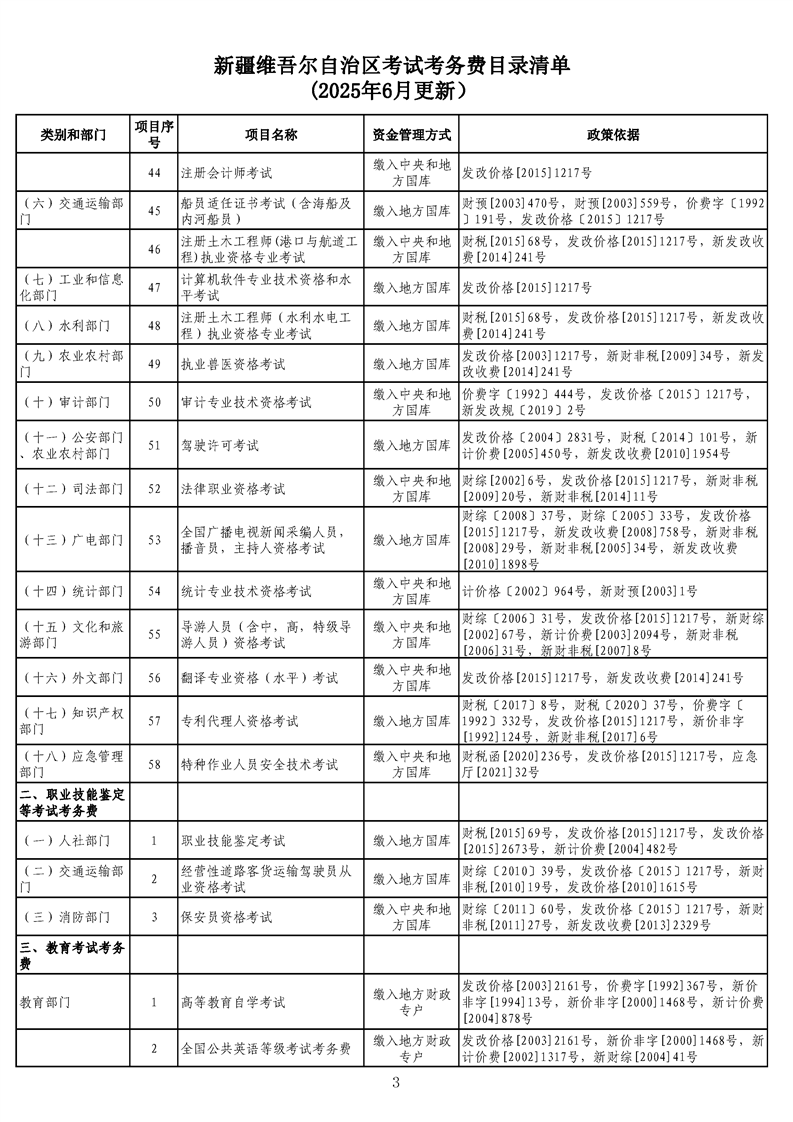 新疆维吾尔自治区考试考务费目录清单(2025年6月更新)