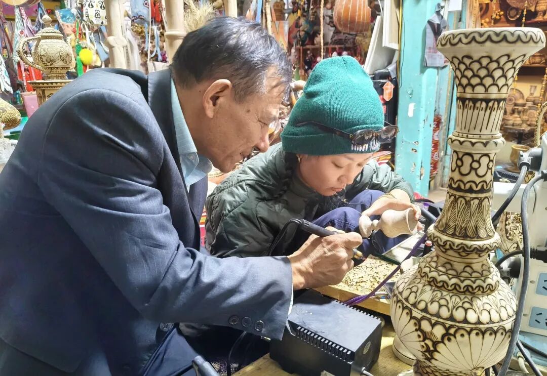 玉山江作为喀什市传统木雕技艺非物质文化遗产代表性传承人,从传统木雕技艺到如今的烫画,将自己研究半生的传统木雕技艺从作坊搬进了游客触手可及的空间里,让非物质文化遗产不再是展柜里的标本,而是能亲手触摸的温度。