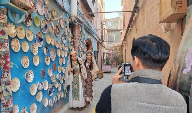 “扶瑶摄影”旅拍店经营业主苏麦耶·热合曼说:“冬季的喀什古城光线柔和,是理想的旅拍时节。我们为此推出了多款主题体验套餐,并聘请了6名本地居民为游客提供服饰装饰与搭配指导服务。不仅融入了本地文化特色,也带动了周边居民就业,店里日均接待游客超10组,客源覆盖全国各个省市。”