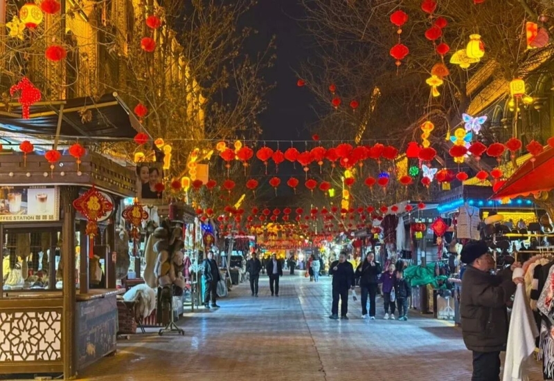 新春启序,华灯初上。夜幕下的喀什市,褪去白日喧嚣,被灯火与烟火包裹得暖意融融。喀什古城街巷流光溢彩,居民小区周边香气沁人心脾,游客与市民踏着夜色而来,赏灯火、购年货、品美食、话团圆。一串串欢声笑语、一缕缕人间烟火,勾勒出喀什市新春夜间最动人的图景,让这座丝路古城在夜色中焕发勃勃生机。