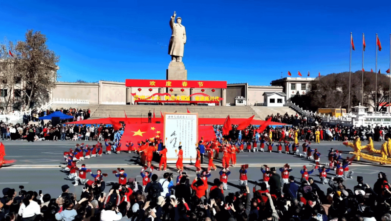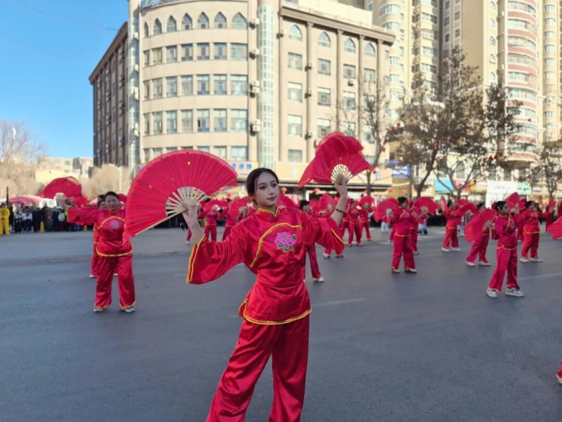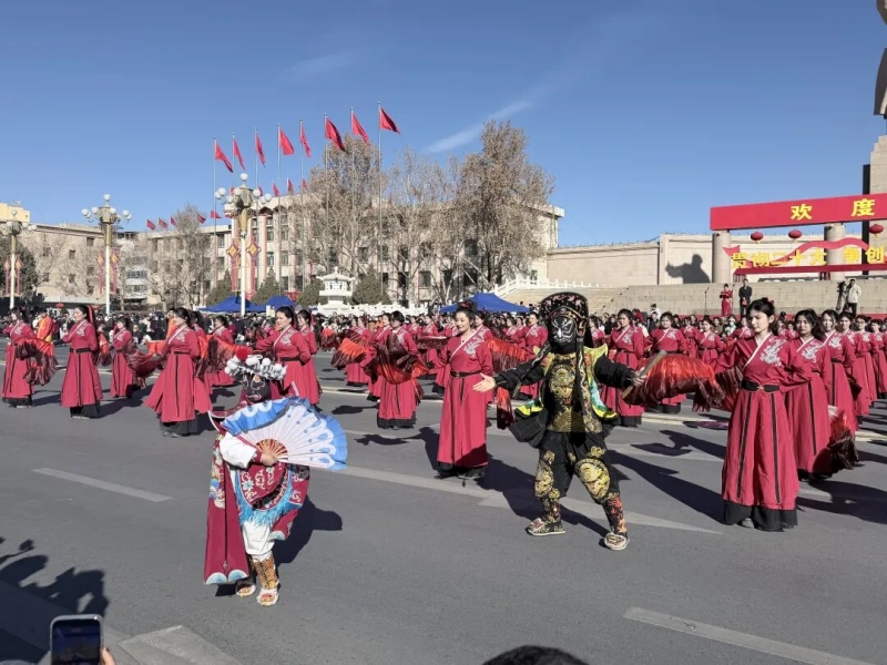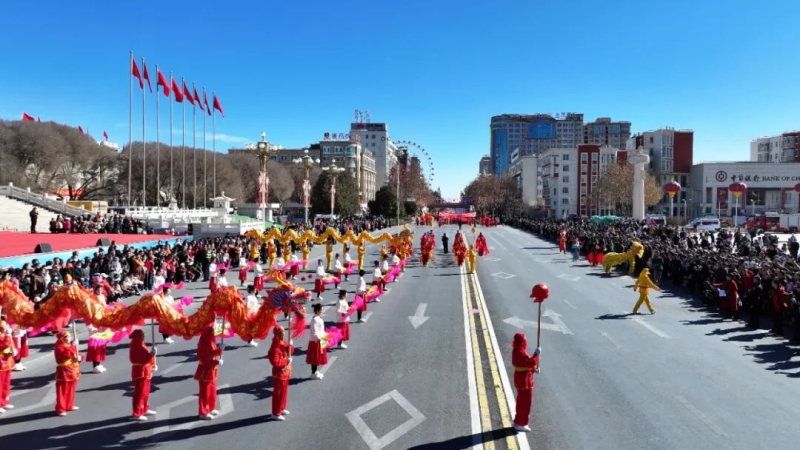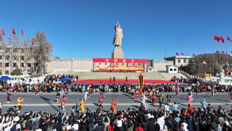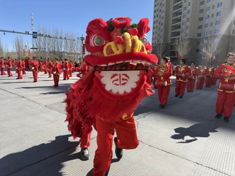12时整,铿锵有力的锣鼓声应声而起,喀什市人民广场主会场和东城和平路分会场顿时欢腾起来。威风凛凛的舞狮翻腾跳跃、憨态可掬,蜿蜒矫健的金龙凌空飞舞、气势磅礴,秧歌队员手持彩扇翻飞起舞、喜气盈盈,一招一式、一步一舞,既舞出了新春的喜庆祥和,也扭出了喀什市各族群众的幸福生活。